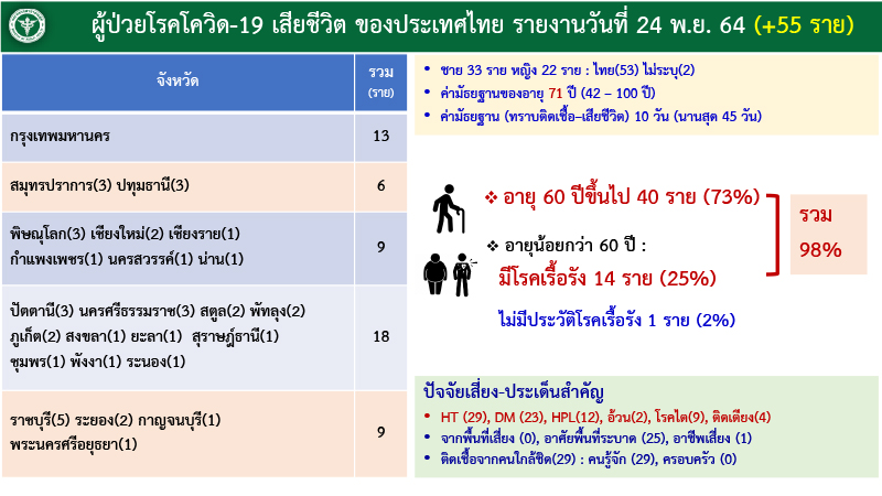 โดยผู้เสียชีวิต 55 ราย พบมากสุดที่ กทม. 13 ราย จังหวัดอื่นๆ 42 ราย เป็นเพศชาย 33 คน หญิง 22 คน เป็นผู้สูงอายุและกลุ่มโรคเรื้อรัง 98%