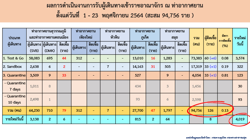 ส่วนรายงานการเดินทางเข้ามาในราชอาณาจักร ประจำวันที่ 24 พฤศจิกายน 2564 มีผู้เดินทางเข้าประเทศ 4,019 ราย จำแนกเป็น Test and Go 3,574 ราย Sandbox 322 ราย กักตัว 7 วัน 30 ราย และ กักตัว 10 วัน 93 ราย รวมสะสมผู้เดินทางเข้าประเทศ ตั้งแต่ 1 พ.ย.2564 จำนวน 94,756 ราย โดยวันนี้พบผู้ติดเชื้อรายใหม่ 8 ราย สะสมแล้ว 126 ราย คิดเป็นอัตราการติดเชื้อ 0.13%