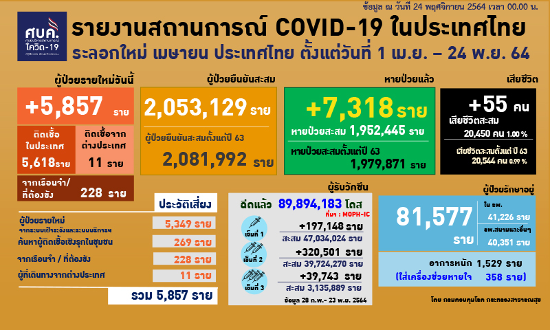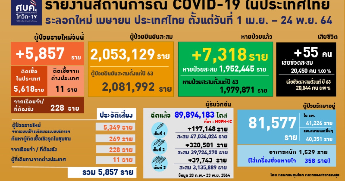 สำนักข่าวอิศรา (www.isranews.org) รายงานว่า เมื่อวันที่ 24 พฤศจิกายน 2564 พญ.สุมนี วัชรสินธุ์ ผู้อำนวยการสำนักสื่อสารความเสี่ยงและพัฒนาพฤติกรรมสุขภาพ กรมควบคุมโรค ในฐานะผู้ช่วยรองโฆษกศูนย์บริหารสถานการณ์โควิด (ศบค.) รายงานสถานการณ์ประจำวัน พบผู้ป่วยรายใหม่ 5,857 ราย ติดเชื้อในประเทศ 5,618 ราย มาจากระบบบริการ 5,349 ราย เกิดจากการตรวจคัดกรองเชิงรุก 269 ราย ติดเชื้อในเรือนจำ 228 ราย และอีก 24 รายเดินทางกลับจากต่างประเทศ ทำให้มีผู้ป่วยสะสมทั้งหมด 2,081,992 ราย และมีผู้ติดเชื้อเข้าข่าย (ATK) จำนวน 1,860 ราย