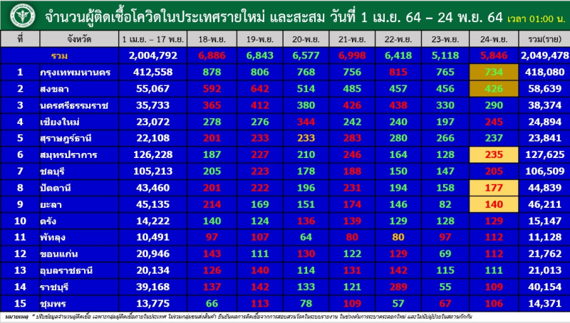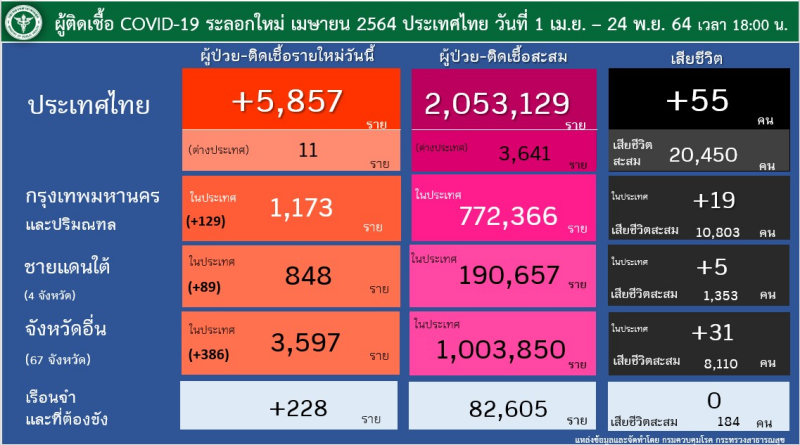 อนึ่งเมื่อเวลา 08.00 น. สำนักข่าวอิศรา (www.isranews.org) รายงานสถานการณ์การแพร่ระบาดเชื้อไวรัสโควิด-19 ประเทศไทย ประจำวันที่ 24 พฤศจิกายน 2564 ว่า มีผู้ติดเชื้อรายใหม่ 5,857 ราย