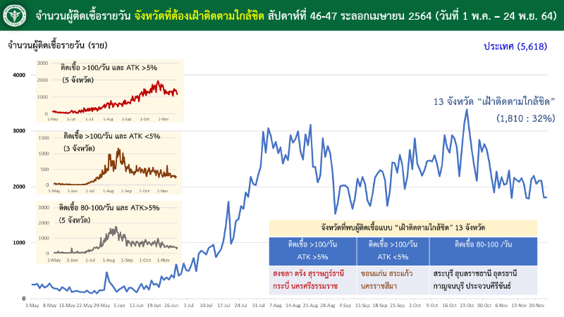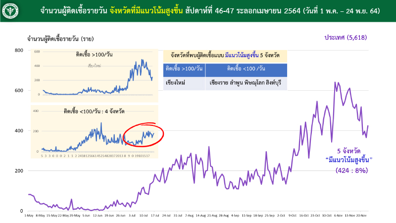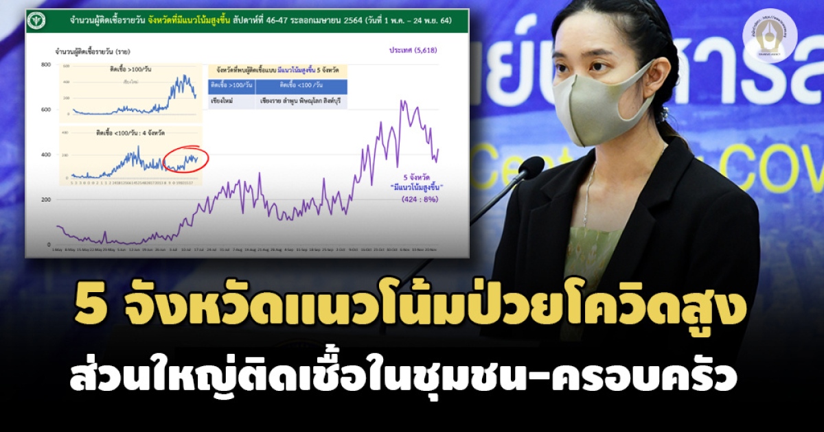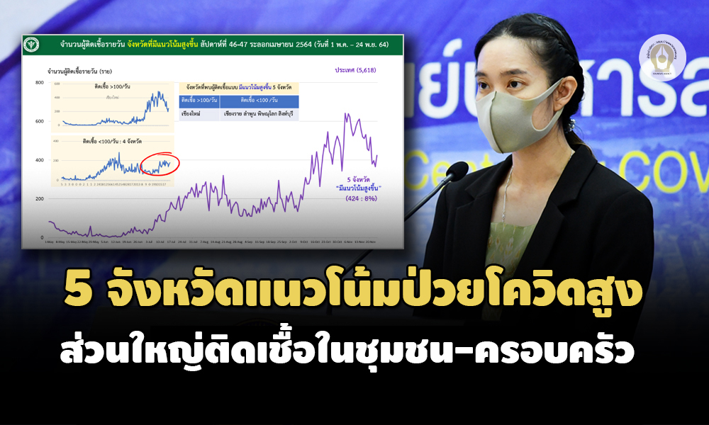สำนักข่าวอิศรา (www.isranews.org) รายงานว่า เมื่อวันที่ 24 พฤศจิกายน 2564 พญ.สุมนี วัชรสินธุ์ ผู้อำนวยการสำนักสื่อสารความเสี่ยงและพัฒนาพฤติกรรมสุขภาพ กรมควบคุมโรค ในฐานะผู้ช่วยรองโฆษกศูนย์บริหารสถานการณ์โควิด (ศบค.) เปิดเผยว่า สถานการณ์การระบาดของโควิดในไทยขณะนี้ มี 5 จังหวัดที่มีแนวโน้มผู้ติดเชื้อเพิ่มขึ้นต่อเนื่อง ประกอบด้วย เชียงใหม่ เชียงราย ลำพูน พิษณุโลก และสิงห์บุรี คิดเป็นสัดส่วน 8% ของภาพรวมทั้งประเทศ โดยจังหวัดที่มีผู้ติดเชื้อมากกว่า 100 รายต่อวัน คือ เชียงใหม่