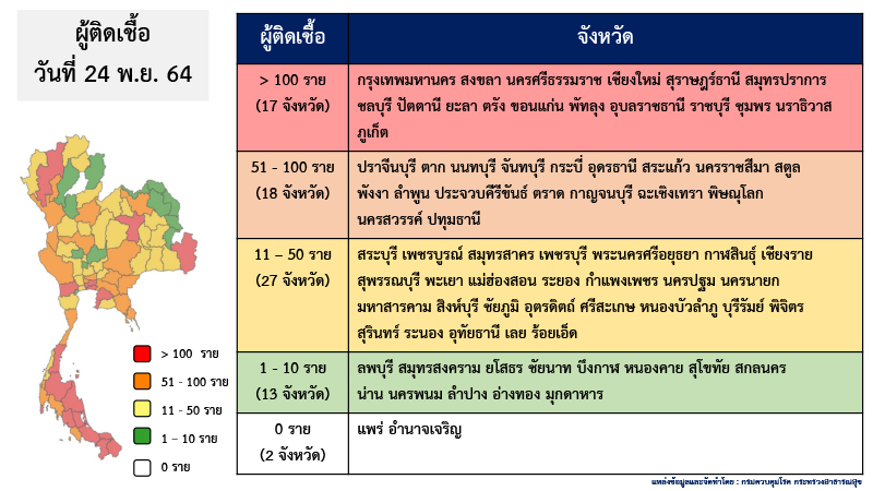 พญ.สุมนี กล่าวด้วยว่า เมื่อจำแนกข้อมูลผู้ป่วยประจำวันที่ 24 พ.ย.2564 ที่มีจำนวน 5,857 ราย พบว่า จังหวัดที่มีผู้ติดเชื้อมากกว่า 100 ราย มีทั้งหมด 17 จังหวัด จังหวัดที่มีผู้ติดเชื้อ 51-100 ราย มี 18 จังหวัด จังหวัดที่มีผู้ติดเชื้อ 11-50 ราย มี 27 จังหวัด จังหวัดที่มีผู้ติดเชื้อ 1-10 ราย มี 13 จังหวัด และจังหวัดที่ไม่พบผู้ติดเชื้อ มี 2 จังหวัด คือ แพร่ และอำนาจเจริญ
