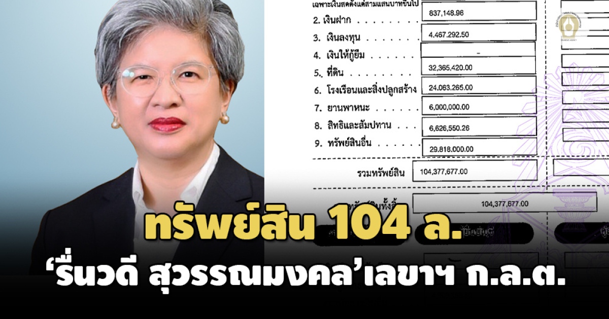 เปิดทรัพย์สิน 104 ล้านบาท ‘รื่นวดี สุวรรณมงคล’ เลขาฯ ก.ล.ต. เป็นที่ดิน-โรงเรือนและสิ่งปลูกสร้าง 56.42 ล้านบาท ส่วนรายได้ต่อปี 16.06 ล้านบาท กว่า 15.50 ล้านบาท เป็น เงินเดือน-เบี้ยประชุม-โบนัส
