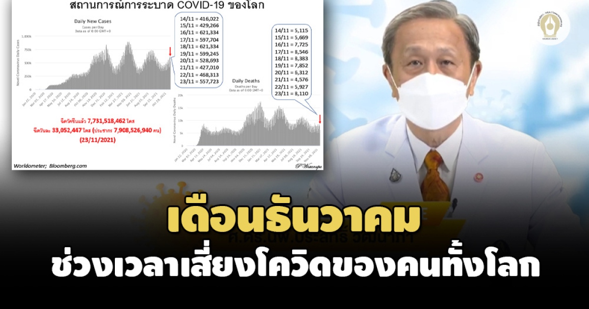 สถานการณ์ของโลก พบว่า ตั้งแต่เดือนตุลาคม 2564 การติดเชื้อต่อวันของทั่วโลกกำลังอยู่ในช่วงขาขึ้น ก่อนหน้านี้ตัวเลขผู้ติดเชื้อทั่วโลกเคยลดลงไปเหลือ 3 แสนรายต่อวัน แต่ตอนนี้กลับมามีผู้ติดเชื้อเกิน 5-6 แสนรายต่อวัน ขณะเดียวกัน เมื่อดูอัตราการเสียชีวิตตัวเลขยังลดลง ปัจจัยสำคัญคือการฉีดวัคซีนที่ฉีดทั่วโลกไปแล้ว 7,731 ล้านโดส จากประชากรทั่วโลก 7,908 ล้านราย และมีการฉีดวัคซีนประมาณ 33 ล้านโดสต่อวัน