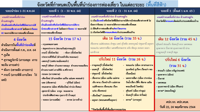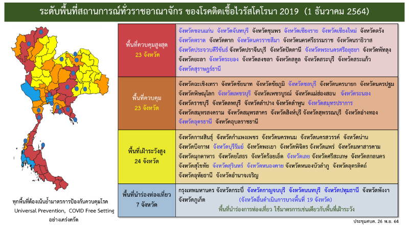 นอกจากนี้ ยังมีการปรับระดับพื้นที่ ยกเลิกพื้นที่สีแดงเข้ม เพิ่มพื้นที่สีฟ้าหรือพื้นที่นำร่องท่องเที่ยวเป็น 7 จังหวัด และเมื่อไม่มีพื้นที่สีแดงเข้มจึงยกเลิกการออกนอกเคหสถาน (เคอร์ฟิว) ทุกพื้นที่ ทำให้ขณะนี้มีการปรับระดับพื้นที่ ได้แก่ พื้นที่ควบคุมสูงสุด (สีแดง) 39 จังหวัด ปรับเป็น 23 จังหวัด พื้นที่ควบคุม (สีส้ม) 23 จังหวัด ปรับเป็น 23 จังหวัด พื้นที่เฝ้าระวังสูง (สีเหลือง) 5 จังหวัด ปรับเป็น 24 จังหวัด พื้นที่เฝ้าระวัง (สีเขียว) ไม่มี และพื้นที่สีฟ้า (นำร่องการท่องเที่ยว) 4 จังหวัด ปรับเป็น 7 จังหวัด ได้แก่ กทม. กระบี่ กาญจนบุรี นนทบุรี ปทุมธานี พังงา และภูเก็ต ทั้งนี้ให้มีผลตั้งแต่วันที่ 1 ธ.ค.2564 เป็นต้นไป