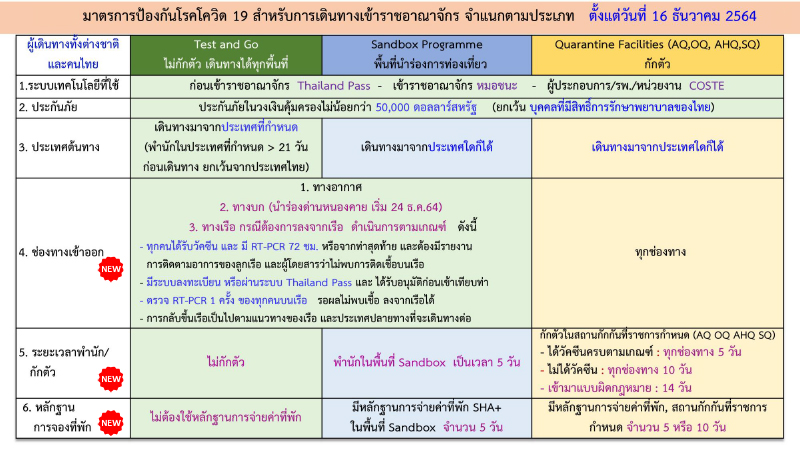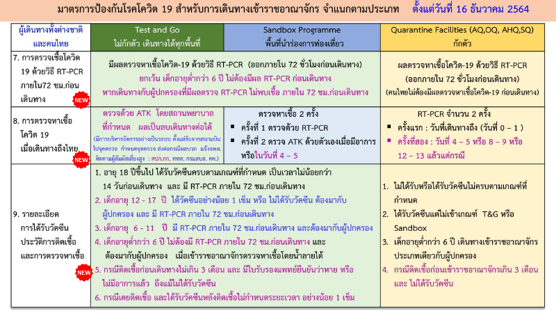 นอกจากนี้ยังเพิ่มการเดินทางเข้าประเทศทั้งทางบก และทางเรือ โดยจะนำร่องเข้าผ่านทาง จ.หนองคาย เริ่ม 24 ธ.ค.2564 แต่การเดินทางเข้าประเทศผ่านทางเรือจะมีข้อกำหนด คือ ต้องได้รับวัคซีน และจะมีการตรวจ RT-PCR บนเรือ เป็นต้น ซึ่งมาตรการป้องกันโควิดสำหรับการเดินทางเข้าราชอาณาจักรไทยทั้งหมดนี้ จะมีผลตั้งแต่ 16 ธ.ค.2564