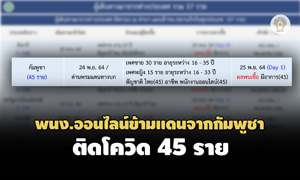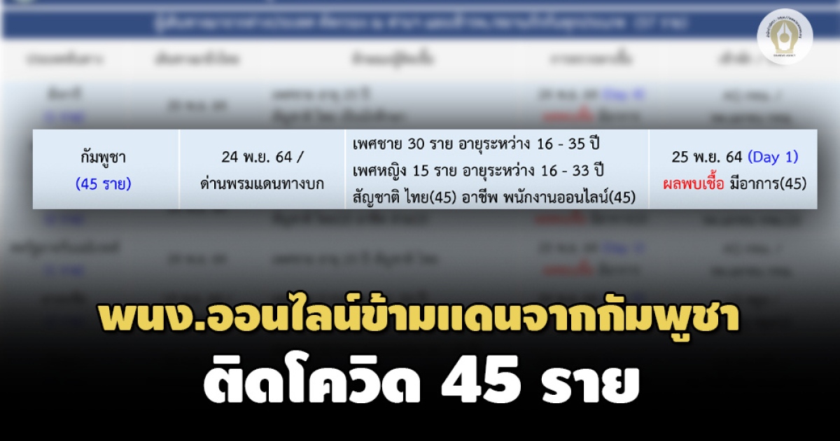 ศบค.พบพนักงานออนไลน์ข้ามแดนจากกัมพูชา ติดโควิด 45 ราย อายุระหว่าง 16-35 ปี โดยทั้งหมดมีสัญชาติไทย