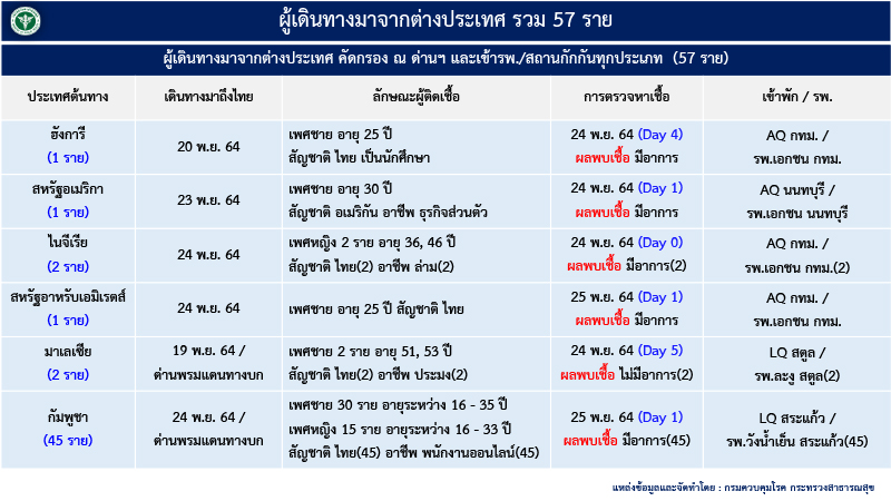สำหรับผู้ป่วยที่เดินทางมาจากกัมพูชา 45 ราย ระบุว่าเดินทางมาถึงไทย 24 พ.ย.2564 ผ่านด่านพรมแดนทางบก เป็นผู้ที่มีสัญชาติไทยทั้ง 45 ราย แบ่งเป็นชาย 30 ราย อายุระหว่าง 16-35 ปี เป็นหญิง 15 ราย อายุระหว่าง 16-33 ปี และทั้งหมดเป็นพนักงานออนไลน์