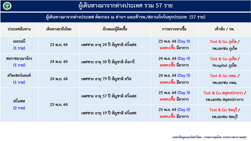 ศบค.ระบุว่า ผู้ป่วยรายใหม่ที่เดินทางมาจากจากต่างประเทศ ทั้งหมด 57 ราย แบ่งเป็น เยอรมนี 1 ราย สหราชอาณาจักร 1 ราย สวิตเซอร์แลนด์ 1 ราย ฝรั่งเศส 2 ราย ฮังการี 1 ราย สหรัฐอเมริกา 1 ราย ไนจีเรีย 2 ราย สหรัฐอาหรับเอมิเรตส์ 1 ราย มาเลเซีย 2 ราย และกัมพูชา 45 ราย