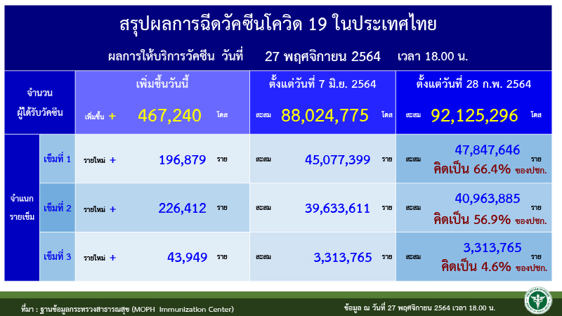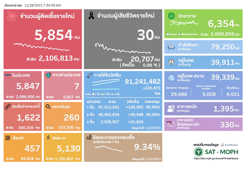 อนึ่งเมื่อเวลา 08.30 น. สำนักข่าวอิศรา (www.isranews.org) รายงานว่า สถานการณ์โควิดประจำวัน 28 พ.ย. 2564 พบผู้ป่วยรายใหม่ 5,854 ราย จำแนกเป็น ติดเชื้อในประเทศ 5,847 ราย เกิดจากระบบเฝ้าระวังและระบบบริการฯ 5,130 ราย เกิดจากการค้นหาเชิงรุกและพบการติดเชื้อในชุมชน 260 ราย ติดเชื้อภายในเรือนจำ 457 ราย อีก 7 รายเดินทางกลับมาจากต่างประเทศ ทำให้มีผู้ป่วยสะสม 2,106,813 ราย