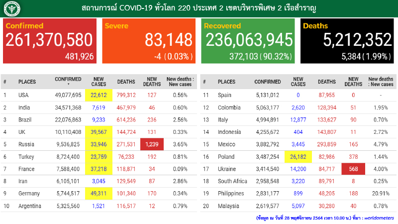 ขณะที่สถานการณ์ทั่วโลกพบผู้ป่วยเพิ่ม 481,926 ราย รวม 261,370,580 ราย อาการหนัก 83,148 ราย หายป่วย 236,063,945 ราย เสียชีวิต 5,212,352 ราย โดยสหรัฐอเมริกาพบผู้ป่วยเพิ่ม 22,612 ราย รวม 49,077,695 ราย เสียชีวิตเพิ่ม 127 ราย รวม 799,312 ราย อินเดีย พบเพิ่ม 7,619 ราย รวม 34,571,368 ราย เสียชีวิต 46 ราย รวม 467,979 ราย บราซิล พบเพิ่ม 9,233 ราย รวม 22,076,863 ราย เสียชีวิตเพิ่ม 236 ราย รวม 614,236 ราย ส่วนไทยอยู่ในอันดับที่ 24 ของโลก