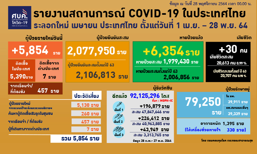 สำนักข่าวอิศรา (www.isranews.org) รายงานว่า เมื่อวันที่ 28 พ.ย. 2564 ศูนย์บริหารสถาการณ์โควิด-19 (ศบค.) รายงานสถานการณ์ประจำวัน โดยพบผู้ป่วยรายใหม่ 5,854 ราย จำแนกเป็น ติดเชื้อในประเทศ 5,390 ราย เกิดจากระบบเฝ้าระวังและระบบบริการฯ 5,130 ราย เกิดจากการค้นหาเชิงรุกและพบการติดเชื้อในชุมชน 260 ราย ติดเชื้อภายในเรือนจำ 457 ราย อีก 7 รายเดินทางกลับมาจากต่างประเทศ รวมผู้ป่วยสะสม 2,106,813 ราย