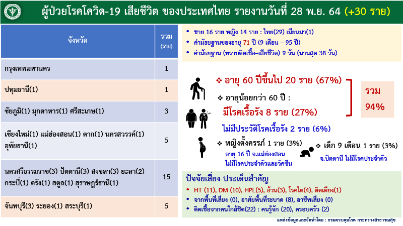 ไทยป่วยโควิด 5,854 ราย หายป่วย 6,354 ราย อยู่ระหว่างรักษา 79,250 ราย ตาย 30 ราย เป็นผู้สูงอายุ-โรคเรื้อรัง 94% ในจำนวนนี้มีหญิงตั้งครรภ์อายุ 16 ปี เสียชีวิตด้วย