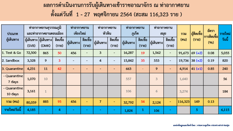 ส่วนรายงานการเดินทางเข้ามาในราชอาณาจักร ตั้งแต่ 1 พ.ย. 2564 มีผู้เดินทางเข้าประเทศรายใหม่ 6,115 ราย รวมสะสม 116,323 ราย จำแนกเป็น Test and Go 91,673 ราย Sandbox 19,736 ราย กักตัว 7 วัน 1,640 ราย และ กักตัว 10 วัน 3,274 ราย ติดเชื้อใหม่ 5 ราย รวมสะสม 149 ราย คิดเป็นอัตราการติดเชื้อ 0.13%