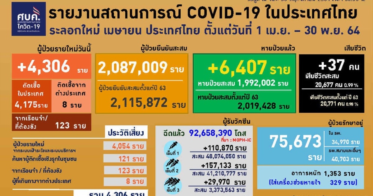 สำนักข่าวอิศรา (www.isranews.org) รายงานว่า เมื่อวันที่ 30 พ.ย. 2564 ศูนย์บริหารสถาการณ์โควิด-19 (ศบค.) รายงานสถานการณ์ประจำวัน โดยพบผู้ป่วยรายใหม่ 4,306 ราย จำแนกเป็น ติดเชื้อในประเทศ 4,298 ราย เกิดจากระบบเฝ้าระวังและระบบบริการฯ 4,054 ราย เกิดจากการค้นหาเชิงรุกและพบการติดเชื้อในชุมชน 121 ราย ติดเชื้อภายในเรือนจำ 123 ราย อีก 8 รายเดินทางกลับมาจากต่างประเทศ รวมผู้ป่วยสะสม 2,115,872 ราย
