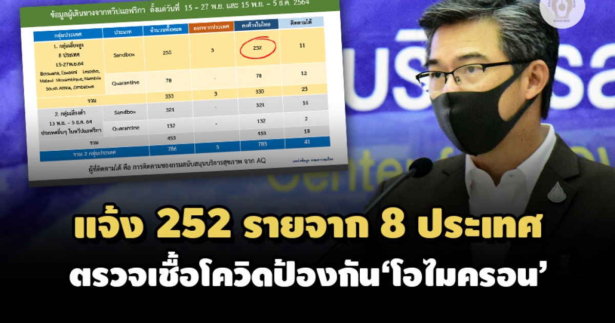 ศบค.ติดตามตัว 252 นักท่องเที่ยว จาก 8 ประเทศทวีปแอฟริกาใต้ ตรวจโควิด ป้องกัน ‘โอไมครอน’ ระบาด นับตั้งแต่ 1 ธ.ค.มีคำสั่งห้ามเข้าประเทศ ยกเว้นคนไทย