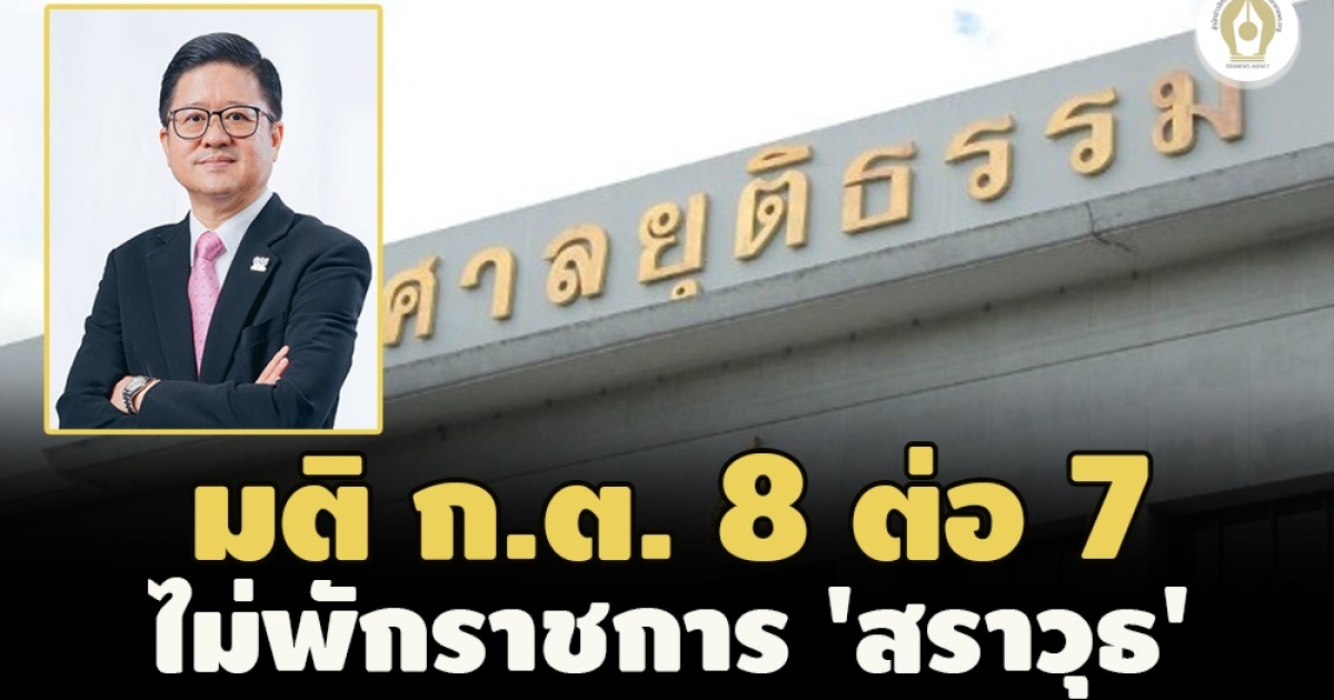 มติ ก.ต. 8 ต่อ 7 เสียง ไม่สั่งพักราชการ 'สราวุธ เบญจกุล' อดีตเลขาธิการสำนักงานศาลยุติธรรม คดีจ้างปรับปรุงศาลพระโขนง เหตุผลการสอบสวนใกล้เสร็จสิ้นแล้ว ช่วงกลางเดือน ธ.ค. ควรรอผลเป็นทางการก่อน