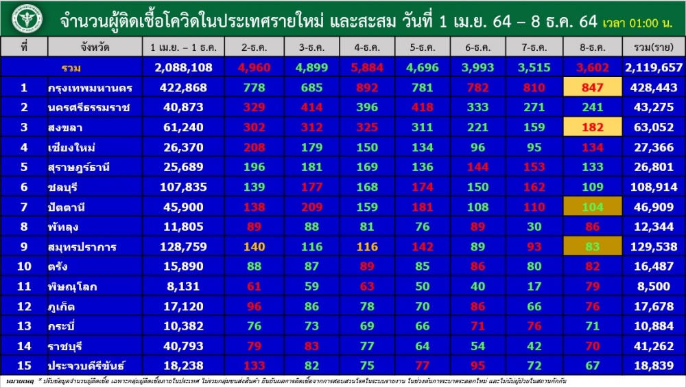 สำหรับจำนวนผู้ติดเชื้อในประเทศรายใหม่ 10 จังหวัดอันดับสูงสุด ประกอบด้วย กทม.847 ราย นครศรีธรรมราช 241 ราย สงขลา 182 ราย เชียงใหม่ 134 ราย สุราษฎร์ธานี 133 ราย ชลบุรี 109 ราย ปัตตานี 104 ราย พัทลุง 86 ราย สมุทรปราการ 83 ราย และตรัง 82 ราย