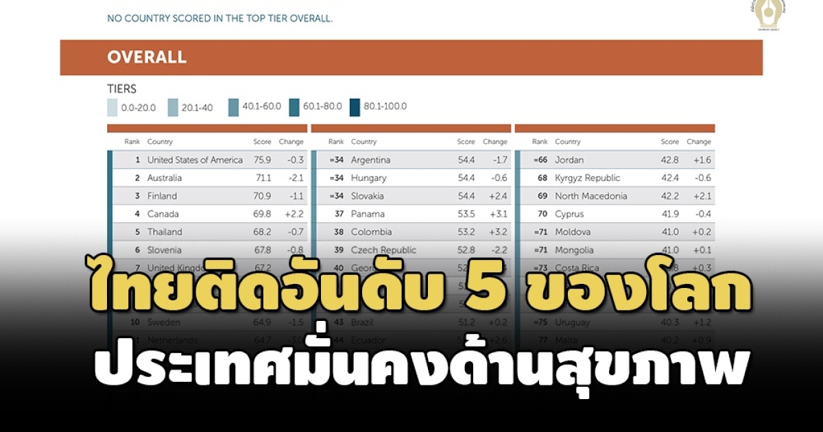 ‘GHS Index’ประเมินความพร้อมการรับมือโรคระบาด 195 ประเทศทั่วโลก จัดอันดับไทยติดท็อป 5 ประเทศที่มีความมั่นคงด้านสุขภาพด้วยคะแนน 68.2