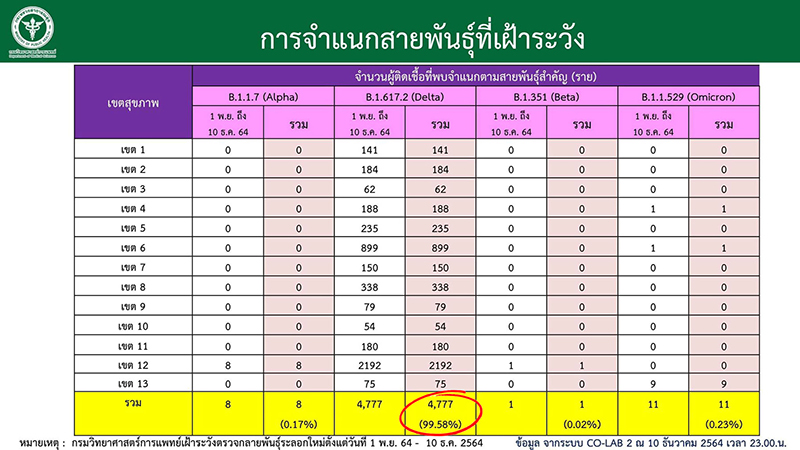 ส่วนประเทศไทย ขณะนี้มากที่สุดยังเป็นสายพันธุ์เดลต้า 99.58% ส่วนสายพันธุ์โอไมครอน คิดเป็น 0.23% สายพันธุ์อัลฟ่า 0.17% และสายพันธุ์เบต้า 0.02%