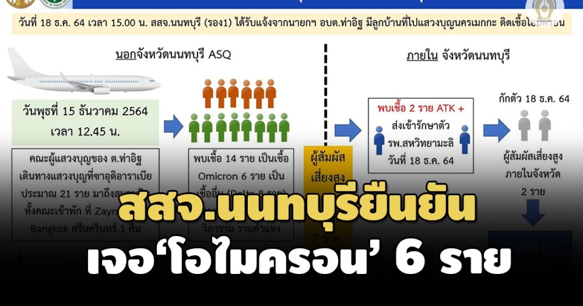 สสจ.นนทบุรียืนยันพบผู้ติดเชื้อโอไมครอน 6 ราย กลับจากแสวงบุญที่นครเมกกะ ประเทศซาอุดิอาระเบีย เร่งติดตามผู้สัมผัสเสี่ยงสูง เจอผลตรวจ ATK บวก 2 ราย อีก 7 รายส่งกักตัวแล้ว