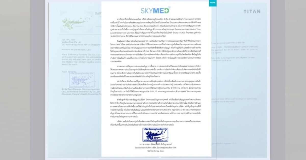 จากปัญหาที่เกิดขึ้นในประเทศไทย บริษัท เมืองเศรษฐกิจพอเพียง จํากัด เจ้าของแบรนด์สินค้าด้านการแพทย์ SKYMED ขอชี้แจงดังนี้ การดําเนินการที่จะพัฒนาศูนย์กลางการผลิตถุงมือไนไตรล์ในประเทศไทย เป็นแนวความคิดและเจตนารมณ์ที่แท้จริงของ บริษัทฯ ตั้งแต่ในห้วง มิถุนายน - ธันวาคม 2563 ซึ่งเจตนารมณ์ดังกล่าว ยังไม่เป็นไปตามเป้าหมาย เนื่องจากการผิดสัญญาทางการค้า มูลค่ามหาศาลที่เกิดขึ้นจากกลุ่มลูกค้าที่ลงนามในสัญญาซื้อขายขนาดใหญ่หลายกลุ่ม โดยเฉพาะจากกลุ่ม Medico Titan, Lund Entertainment และ VLSG ที่มีมูลค่าสัญญาการสั่งซื้อและสั่งผลิตถุงมือไนไตรล์ จํานวน 144,400 ล้านกล่อง มูลค่ากว่า 30,000,000 ล้านบาท ที่ทําให้เกิดกระแส SKYMED และเกิดการปลอมแปลงทั่วโลก