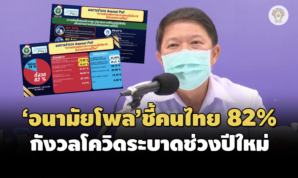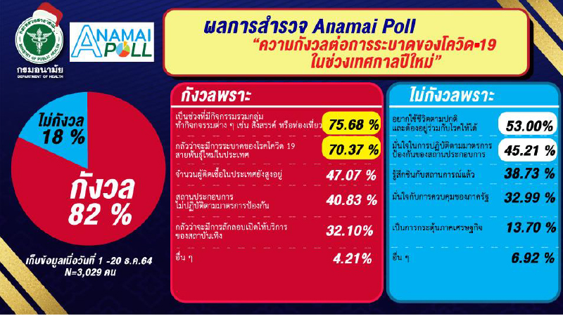 ผู้สื่อข่าวรายงานว่า เมื่อวันที่ 21 ธ.ค.2564 นพ.สุวรรณชัย วัฒนายิ่งเจริญชัย อธิบดีกรมอนามัย กล่าวถึงการป้องกันตนเองและครอบครัวในช่วงเทศกาลปีใหม่ว่า จากผลการสำรวจอนามัยโพล (Anamai Poll) ระหว่างวันที่ 1-20 ธ.ค.2564 พบว่า ประชาชนจำนวน 3,029 ราย ส่วนใหญ่ยังกังวลต่อการระบาดของโควิดถึง 82% โดยในจำนวนดังกล่าว 75.68% กังวลเพราะช่วงเทศกาลเป็นช่วงที่มีกิจกรรมรวมกลุ่มกันมาก เช่น สังสรรค์ หรือท่องเที่ยว รองลงมา กลัวว่าจะมีการระบาดของโควิดสายพันธุ์ใหม่ 70.37% กังวลเพราะจำนวนผู้ติดเชื้อในประเทศยังสูงอยู่ 47.07% กังวลเพราะสถานประกอบการไม่ปฏิบัติตามมาตรการป้องกัน 40.83% กลัวว่าจะมีการลักลอบเปิดให้บริการของสถานบันเทิง 32.10% ส่วนที่เหลือกังวลด้วยเหตุผลอื่นๆ 4.2%