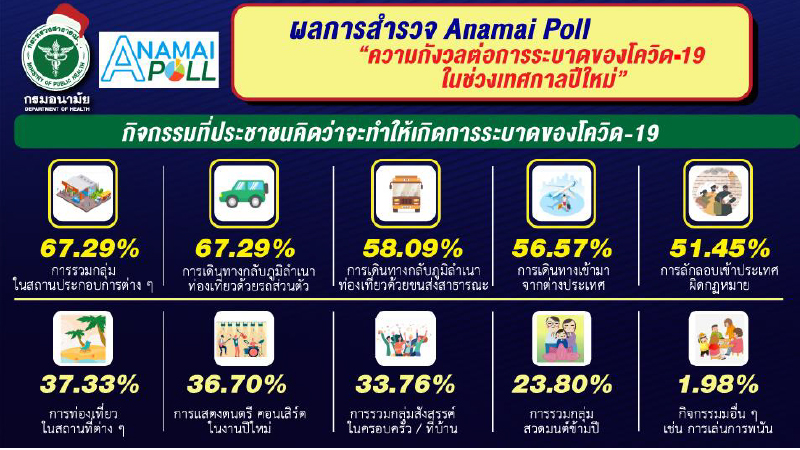 ผลการสำรวจยังชี้ให้เห็นถึงกิจกรรมที่ประชาชนคิดว่าจะทำให้เกิดการระบาด ได้แก่ การรวมกลุ่มในสถานประกอบการต่างๆ 67.29% การเดินทางกลับภูมิลำเนาด้วยรถส่วนตัว 67.29% การเดินทางกลับภูมิลำเนาด้วยขนส่งสาธารณะ 58.09% การเดินทางเข้ามาจากต่างประเทศ 56.57% การลักลอบเข้าประเทศอย่างผิดกฎหมาย 51.45% การท่องเที่ยวในสถานที่ต่างๆ 37.33% การแสดงดนตรี คอนเสิร์ตในงานปีใหม่ 36.07% การรวมกลุ่มสังสรรค์ในครอบครัว หรือที่บ้าน 33.76% การรวมกลุ่มสวดมนต์ข้ามปี 23.80% และกิจกรรมอื่นๆ เช่น การพนัน 1.98%
