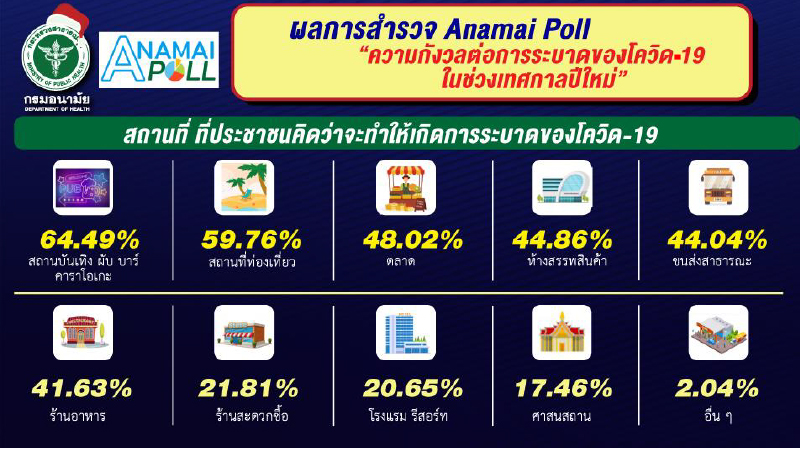 ส่วนสถานที่ที่ประชาชนคิดว่าจะทำให้เกิดการระบาด ได้แก่ สถานบันเทิง ผับ บาร์ คาราโอเกะ 64.49% สถานที่ท่องเที่ยว 59.76% ตลาด 48.02% 4. ห้างสรรพสินค้า 44.86% 5.ขนส่งสาธารณะ 44.04% ร้านอาหาร 41.63% ร้านสะดวกซื้อ 21.81% โรงแรมและรีสอร์ท 20.65% ศาสนสถาน 17.46% และอื่นๆ 2.04%