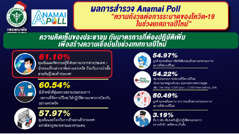 นพ.สุวรรณชัย กล่าวเพิ่มเติมว่า สำหรับมาตรการที่ประชาชนอยากให้ปฏิบัติเพิ่ม เพื่อสร้างความเชื่อมั่นในช่วงเทศกาลปีใหม่ ได้แก่ การคุมเข้มคัดกรองผู้เดินทางมาจากต่างประเทศ 61.10% มีเจ้าหน้าที่สุ่มตรวจสถานประกอบการ หรือสถานที่จัดงานปีใหม่ ให้ปฏิบัติตามมาตรการป้องกันอย่างเคร่งครัด 60.54% การคุมเข้มและป้องกันการลักลอบเข้าประเทศ อย่างผิดกฎหมายตามแนวชายแดน 57.97% การให้แสดงผลการฉีดวัคซีนก่อนเข้าสถานประกอบการต่างๆ 54.97% สถานประกอบการที่จัดงานปีใหม่จะต้องผ่านการรับรองจากกระทรวงสาธารณสุข 54.22% ต้องแสดงผลตรวจ ATK ก่อนเข้าสถานประกอบการหรือสถานที่จัดงานปีใหม่ และ 3.19% อยากให้เข้มงวดกับผู้ไม่ปฏิบัติตามมาตรการอย่างจริงจัง เช่น งดจัดงาน เป็นต้น
