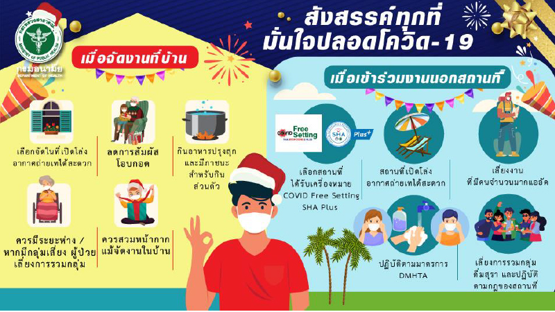 กรณีเข้าร่วมงานนอกสถานที่ ขอให้เลือกสถานที่ที่ได้รับการรับรองหรือมีเครื่องหมาย Covid Free Setting หรือ SHA Plus สถานที่ต้องเปิดโล่งอากาศถ่ายเทสะดวก พยายามเลี่ยงงานที่มีคนจำนวนมากๆ ปฏิบัติตามมาตรการ DMHTA (เว้นระยะห่าง สวมหน้ากากอนามัย หมั่นล้างมือ วัดอุณหภูมิ เช็คอินผ่านแอปพลิเคชัน)และเลี่ยงการรวมกลุ่มดื่มสุรา รวมถึงต้องปฏิบัติตามกฎของสถานที่