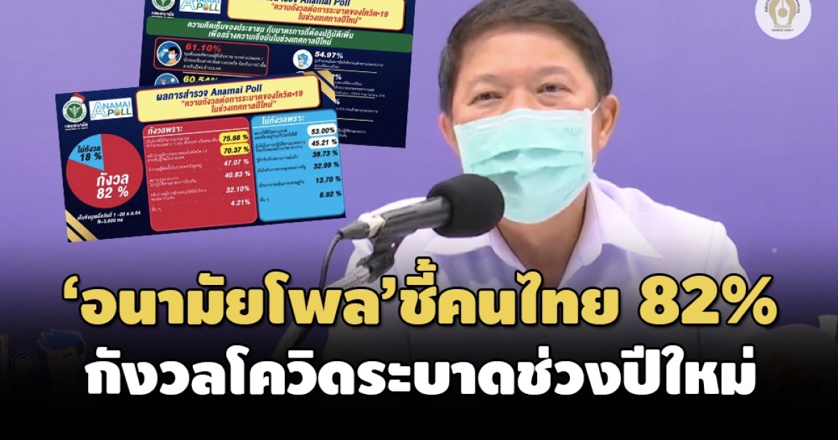 ‘อนามัยโพล’ชี้คนไทย 82% กังวลโควิดระบาดช่วงปีใหม่ กว่า 61% อยากให้คัดกรองนักท่องเที่ยวต่างชาติเข้มสร้างความเชื่อมั่นช่วงเทศกาล สธ.แนะแนวทางป้องกันตัวเอง-ครอบครัว พร้อมย้ำทุกภาคส่วนเคร่งครัดมาตรการ จะทำให้ช่วงเทศกาลนี้เป็นปีที่ปลอดจากโควิดและมีความสุขทุกคน