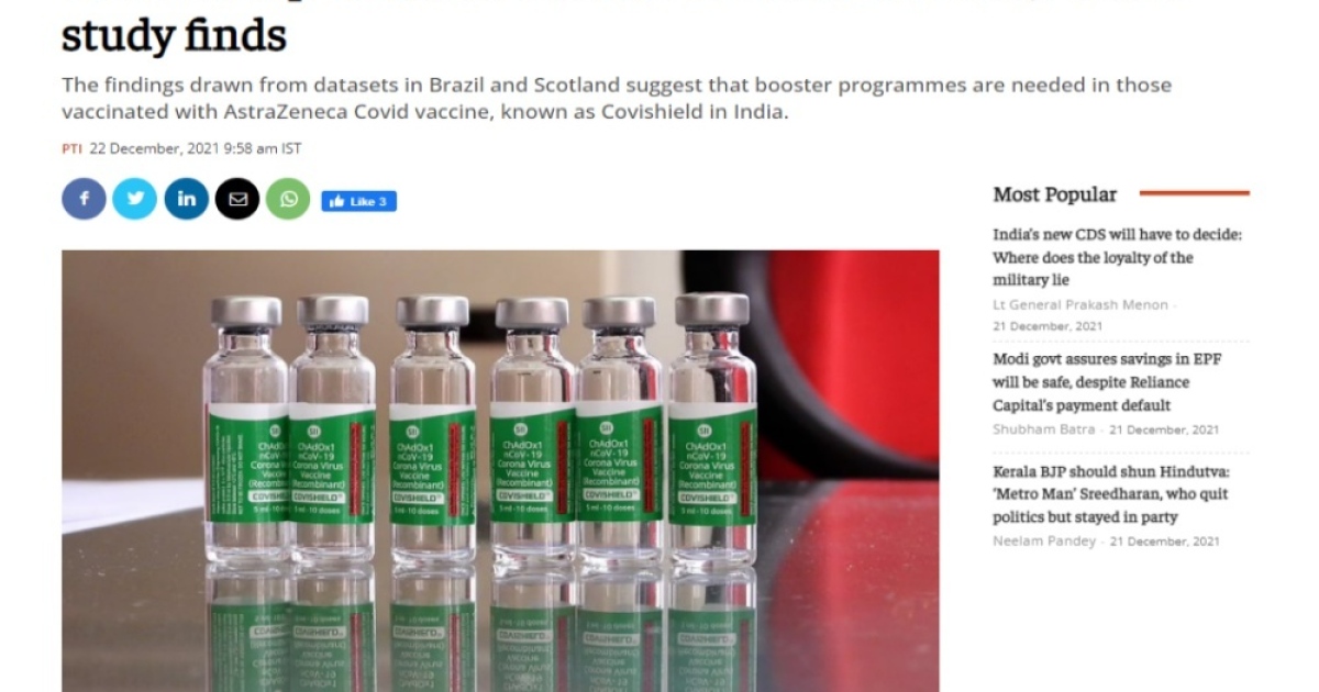 โดยการสืบค้นข้อมูลดังกล่าวมาจากฐานข้อมูลผู้ฉีดวัคซีนของบริษัทแอสตร้าเซนเนก้าจำนวน 42 ล้านคนในประเทศบราซิลและประเทศสกอตแลนด์นั้นสื่อให้เห็นว่าการฉีดวัคซีนบูสเตอร์หรือว่าวัคซีนเข็มสามเป็นสิ่งที่จำเป็นเพื่อจะทำให้คงภูมิคุ้มกันไว้สำหรับการป่วยรุนแรงในกลุ่มผู้ที่ฉีดวัคซีนของบริษัทแอสตร้าเซนเนก้า หรือวัคซีนโควิชิลด์ (Covishield) ซึ่งเป็นวัคซีนของบริษัทแอสตร้าเซนเนก้าที่ผลิตในประเทศอินเดีย