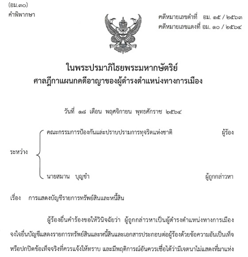 พิพากษาว่า นายสมาน บุญขํา ผู้ถูกกล่าวหา จงใจยื่นบัญชีแสดงรายการทรัพย์สิน และหนี้สินและเอกสารประกอบต่อคณะกรรมการ ป.ป.ช. ด้วยข้อความอันเป็นเท็จหรือปกปิด ข้อเท็จจริงที่ควรแจ้งให้ทราบ และมีพฤติการณ์อันควรเชื่อได้ว่ามีเจตนาไม่แสดงที่มาแห่งทรัพย์สินหรือหนี้สินนั้น กรณีพ้นจากตําแหน่งนายกเทศมนตรีตําบลตลาดเขต อําเภอพนมทวน จังหวัดกาญจนบุรี ตามพระราชบัญญัติประกอบรัฐธรรมนูญว่าด้วยการป้องกันและปราบปรามการทุจริต พ.ศ. 2542 มาตรา 32 และมาตรา 33 ห้ามมิให้ผู้ถูกกล่าวหาดํารงตําแหน่งทางการเมืองหรือ ดํารงตําแหน่งใดในพรรคการเมืองเป็นเวลาห้าปีนับแต่วันที่ 14 กันยายน 2555 อันเป็นวันที่ผู้ถูกกล่าวหาพ้นจากตําแหน่งนายกเทศมนตรีตําบลตลาดเขต อําเภอพนมทวน จังหวัดกาญจนบุรี ตามพระราชบัญญัติประกอบรัฐธรรมนูญว่าด้วยการป้องกันและปราบปรามการทุจริต พ.ศ. 2542 มาตรา 34 วรรคสอง กับมีความผิดตามพระราชบัญญัติประกอบรัฐธรรมนูญว่าด้วยการป้องกันและปราบปรามการทุจริต พ.ศ. 2542 มาตรา 119 จําคุก 2 เดือน และปรับ 8,000 บาท ผู้ถูกกล่าวหาให้การรับสารภาพ เป็นประโยชน์แก่การพิจารณา มีเหตุบรรเทาโทษ ลดโทษให้กึ่งหนึ่ง ตามประมวลกฎหมายอาญา มาตรา 78 คงจําคุก 1 เดือน และปรับ 4,000 บาท ไม่ปรากฏว่าผู้ถูกกล่าวหาเคยได้รับโทษจําคุกมาก่อน โทษจําคุกจึงให้รอการลงโทษไว้มีกําหนด 1 ปี ตามประมวล กฎหมายอาญา มาตรา 56 ไม่ชําระค่าปรับให้จัดการตามประมวลกฎหมายอาญา มาตรา 29, 30. (คดีหมายเลขแดงที่ อม.10/2564 วันที่ 18 พ.ย.2564)