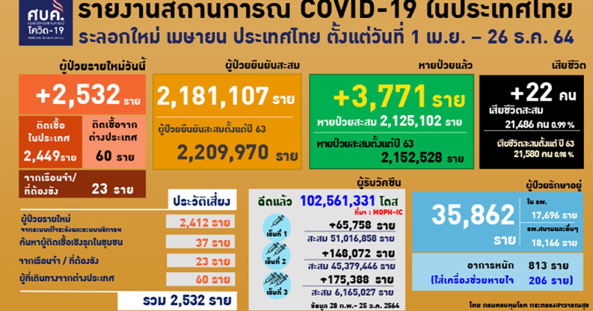 อนึ่งเมื่อเวลา 08.00 น. สำนักข่าวอิศรา (www.isranews.org) เมื่อวันที่ 26 ธ.ค.2564 รายงานสถานการณ์โควิด ประจำวันที่ 26 ธ.ค.2564 พบว่า ผู้มีติดเชื้อรายใหม่ 2,532 ราย สะสมรวม 2,209,970 ราย