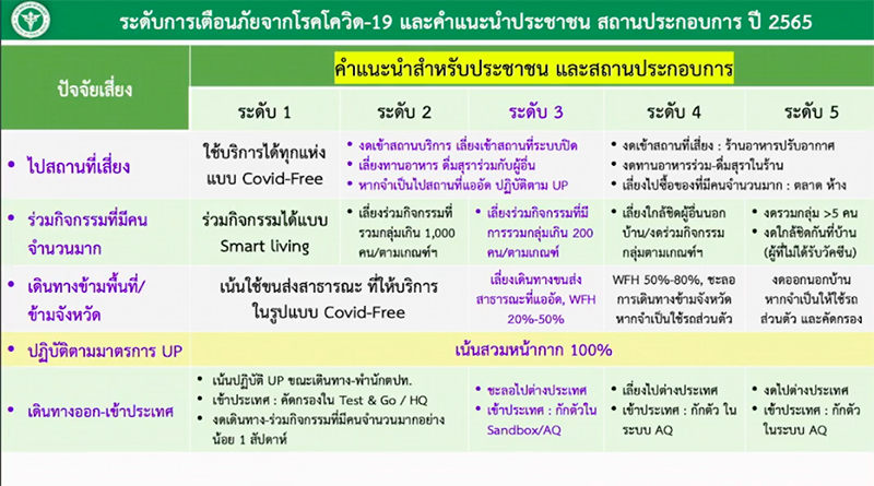 โดยทุกระดับต้องมีการป้องกันโรคขั้นสูงสุด ทั้งนี้ ระดับ 1 ความเสี่ยงน้อยใช้ชีวิตปกติ เปิดทุกอย่างได้ภายใต้มาตรการ Covid Free Settings, ระดับ 2 เร่งเฝ้าระวังคัดกรอง คนยังรวมตัวทำกิจกรรมต่างๆ เปิดระบบ Test and Go, ระดับ 3 จะจำกัดการรวมกลุ่ม, Work From Home, ขนส่งสาธารณะยังดำเนินการได้ตามปกติแต่มีการคัดกรองก่อนเดินทาง, การเดินทางเข้าประเทศใช้ระบบ Sandbox, ระดับ 4 ปิดสถานที่เสี่ยง, Work From Home, ชะลอการเดินทางเข้าประเทศ ให้เข้าเฉพาะระบบกักตัว หรือ Quarantine และระดับ 5 สถานการณ์เลวร้าย ประกาศเคอร์ฟิว, จำกัดการเดินทางและกิจกรรมต่างๆ คัดกรองก่อนเข้าพื้นที่กรณีเดินทางข้ามจังหวัด