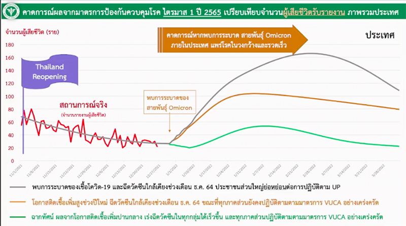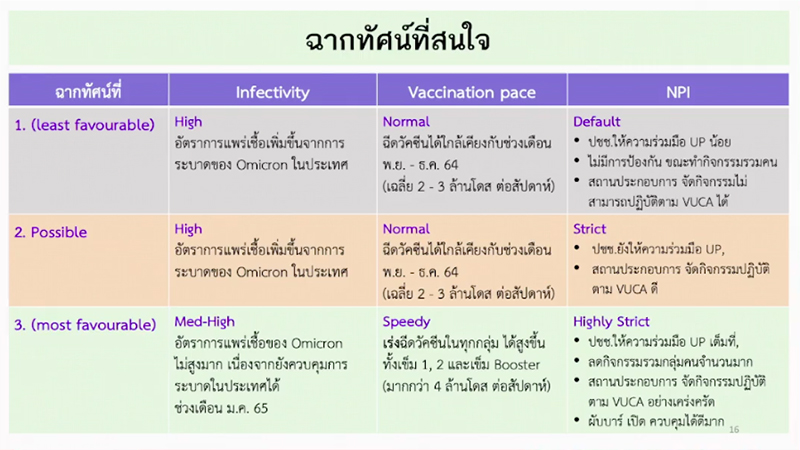 และแบบที่ 3 ดีที่สุด (Most favourable) ซึ่ง สธ.อยากให้เป็นไปตามฉากทัศน์นี้หรือดีกว่านี้ โดยมีอัตราการแพร่เชื้อของโอไมครอนไม่สูงมาก เนื่องจากยังควบคุมการระบาดในประเทศได้ช่วงเดือน ม.ค. 2565 เร่งฉีดวัคซีนในทุกกลุ่มได้สูงทั้งเข็ม 1,2 และเข็มบูสเตอร์มากกว่า 4 ล้านโดสต่อสัปดาห์ และประชาชนให้ความร่วมมือเต็มที่ ลดกิจกรรมรวมกลุ่มคนจำนวนมาก สถานประกอบการ จัดกิจกรรมปฏิบัติตาม VUCA อย่างเคร่งครัด และผับบาร์ เปิด ควบคุมได้ดีมาก จะมีผู้ติดเชื้อราว 10,000 รายต่อวัน ตัวเลขอาจสูงสุด 13,000 ราย และเสียชีวิต 60-70 คนต่อวัน ใช้เวลาควบคุมได้ใน 1-2 เดือน