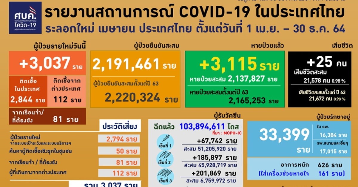 ทั้งนี้ ในจำนวนผู้ติดเชื้อรายใหม่ 3,037 ราย จำแนกเป็นผู้ติดเชื้อจากต่างประเทศ 112 ราย ติดเชื้อในประเทศ 2,794 ราย เป็นผู้ป่วยในเรือนจำ 81รายเป็นผู้ป่วยในจังหวัดกรุงเทพและปริมณฑล 648 ราย ผู้ป่วยใน 4 จังหวัดชายแดนใต้ 135 ราย เป็นผู้ป่วยในจังหวัดอื่น ๆ 2,061 ราย