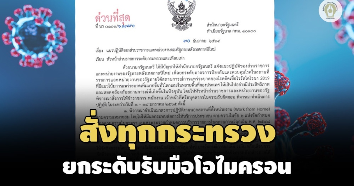 นายกรัฐมนตรีมีหนังสือด่วนถึงทุกกระทรวงสั่งยกระดับคุมเข้มมาตรการรับมือโอไมครอน เวิร์กฟอร์มโฮม-ลดการรวมตัว มีผล 1-14 ม.ค.2565