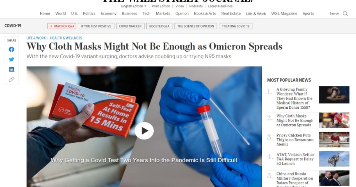 สำนักข่าวอิศรา (www.isranews.org) รายงานข่าวสถานการณ์ที่เกี่ยวกับการระบาดของไวรัสโควิด-19หรือโคโรน่าไวรัสว่า สำนักข่าววอลสตรีท เจอร์นัลของสหรัฐอเมริกา ได้รายงานข่าวว่าการให้หน้ากากผ้าเพียงชั้นเดียวนั้นอาจจะไม่เพียงพอต่อการป้องกันไวรัสที่ติดเชื้อได้สูงอย่างไวรัสโควิดสายพันธุ์โอไมครอน