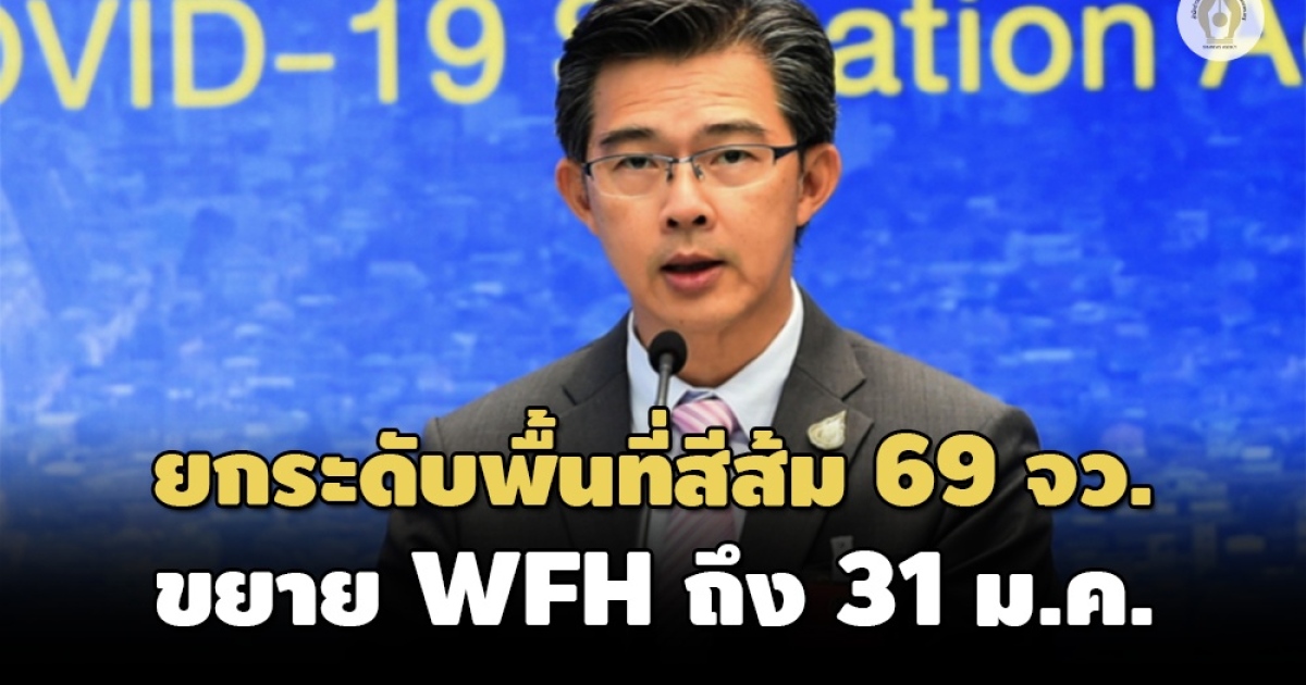 ศบค.เคาะยกระดับพื้นที่สีส้ม 69 จังหวัด คุมเข้มห้ามดื่มแอลกอฮอล์ ส่วน 8 จังหวัดพื้นที่สีฟ้า ดื่มในร้านได้ไม่เกิน 3 ทุ่ม เลื่อนเปิดสถานบันเทิง ผับ บาร์ คาราโอเกะ ยันไม่ล็อกดาวน์ ขยาย Work from Home ไปจนถึง 31 ม.ค.นี้