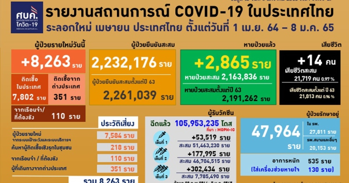 ป่วยโควิดใหม่ 8,263 ราย อาการหนัก 535 ราย สะสม 2.26 ล้านราย ตายเพิ่ม 14 ราย ส่วนนักท่องเที่ยวเข้าไทยติดเชื้อ 351 ราย ฉีดวัคซีนแตะ 105.95 ล้านโดส