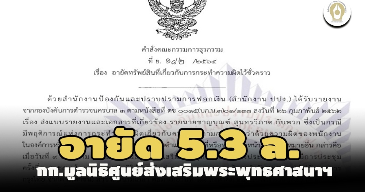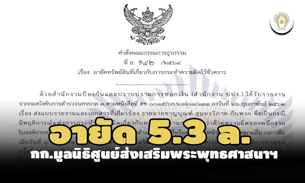 ปปง.อายัดเงินฝาก กรรมการ เหรัญญิก มูลนิธิศูนย์ส่งเสริมพระพุทธศาสนาฯ 5.3 ล. ยักยอกเงินมูลนิธิฯ 41 ล. เข้าบัญชีบริษัทเครือข่ายแล้วโอนให้ตัวเอง ร่วมมือพนักงานแบงก์กรุงไทย หลังศาลอาญาคดีทุจริตฯตัดสินจำคุกคนละ 7-15 ปี