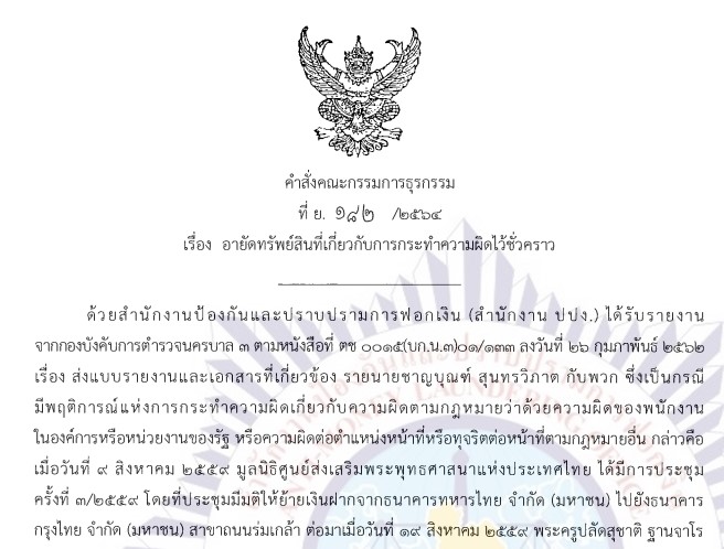สำนักข่าวอิศรา (www.isranews.org) รายงานว่า เมื่อวันที่ 7 ธ.ค. 2564 สำนักงานคณะกรรมการป้องกันและปราบรามการฟอกเงิน (ปปง.) มีคําสั่งคณะกรรมการธุรกรรมที่ ย. 182/2564 เรื่อง อายัดทรัพย์สินที่เกี่ยวกับการกระทําความผิดไว้ชั่วคราว รายนายชาญบุณฑ์ สุนทรวิภาต กรรมการ และเหรัญญิก มูลนิธิศูนย์ส่งเสริมพระพุทธศาสนาแห่งประเทศไทย เงินฝาก จํานวน 2 บัญชี รวม 5,385,281.35 บาท ในคดีนายชาญบุณฑ์ นายวิรัตน์ หาดเจียง พนักงานธนาคารกรุงไทย กับพวก ร่วมกันยักยอกเงินถอนออกจากบัญชีเงินฝากของมูลนิธิศูนย์ส่งเสริมพระพุทธศาสนาฯ จํานวน 41,045,966.67 บาท แล้วนำไปเข้าบัญชีบริษัท 2 แห่งจากนั้นโอนเข้าบัญชีส่วนตัว เหตุเกิดเมื่อปี 2559