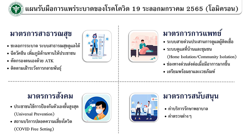 มาตรการสาธารณสุข คือ ชะลอการระบาด ระบบสาธารณสุขดูแลได้ ฉีดวัคซีนเพิ่มภูมิต้านทาน คัดกรองตนเองด้วย ATK และติดตามเฝ้าระวังการกลายพันธุ์