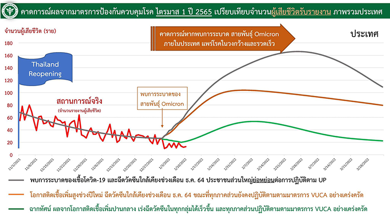 นพ.เกียรติภูมิ กล่าวอีกว่า สำหรับการคาดการณ์ 3 ฉากทัศน์ของกรมควบคุมโรคที่จะเกิดขึ้นหลังจากนี้ พบว่าการแพร่โรคค่อนข้างเกิดขึ้นเร็ว เป็นไปตามเส้นสีเทา คือ พบการติดเชื้อเฉลี่ยวันละ 15,000 – 30,000 ราย ซึ่งหากมาตรการที่เรามีอยู่ได้รับความร่วมมือจากทุกฝ่าย ก็จะสามารถควบคุมโรคได้ดี ทั้งนี้กระทรวงสาธารณสุขพยายามกดการติดเชื้อให้ลดลงตามลำดับ ส่วนการคาดการณ์จำนวนผู้เสียชีวิต เรายังทำได้ดีคือมีตัวเลขต่ำกว่าเส้นสีเขียวเล็กน้อย หรือลี่ยวันละ 20-60 ราย ซึ่งถือว่ามีอัตราที่ลดลง