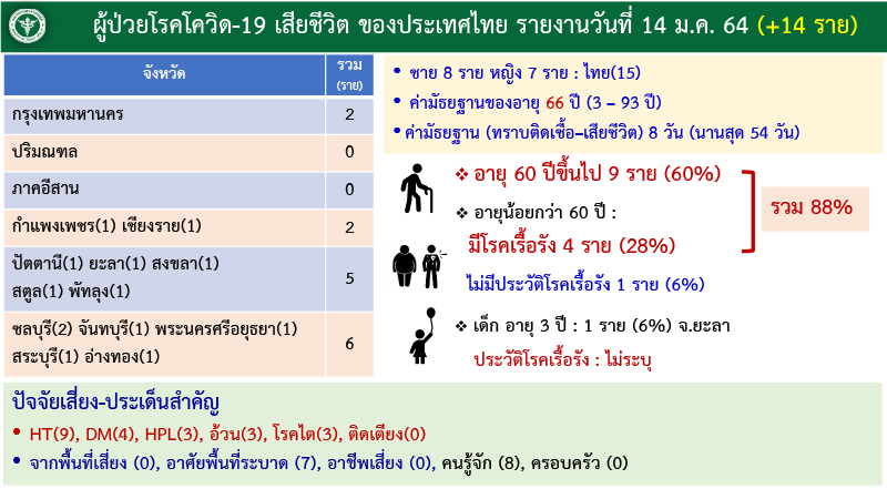 สำหรับผู้เสียชีวิต 15 ราย โดยในจำนวนนี้ มาจาก กทม. 2 ราย ชลบุรี 2 ราย และ กำแพงเพชร เชียงราย ปัตตานี ยะลา สงขลา สตูล พัทลุง จันทบุรี พระนครศรีอยุธยา สระบุรี อ่างทอง จังหวัดละ 1 ราย ทั้งหมดเป็นผู้สูงอายุและกลุ่มโรคเรื้อรัง 88% ทั้งนี้มีเด็กอายุ 3 ปีเสียชีวิต 1 ราย