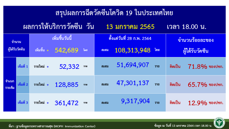 ขณะที่ การกระจายวัคซีนในประเทศ เมื่อวันที่ พบผู้ที่ได้รับผู้ที่ได้รับวัคซีนเข็มที่ 1 เพิ่มเติม จำนวน 52,332 ราย ผู้ได้รับเข็มที่ 2 จำนวน 128,885 ราย และผู้ได้รับเข็มที่ 3 จำนวน 361,472 ราย รวมสะสมผู้ได้รับวัคซีนแล้ว 108,313,948 ราย แบ่งเป็น ผู้ได้รับเข็มที่ 1 จำนวน 51,694,907 ราย คิดเป็น 71.8% ผู้ได้รับเข็มที่ 2 จำนวน 47,301,137 ราย คิดเป็น 65.7% และผู้ได้รับเข็มที่ 3 จำนวน 9,317,904 ราย คิดเป็น 12.9%
