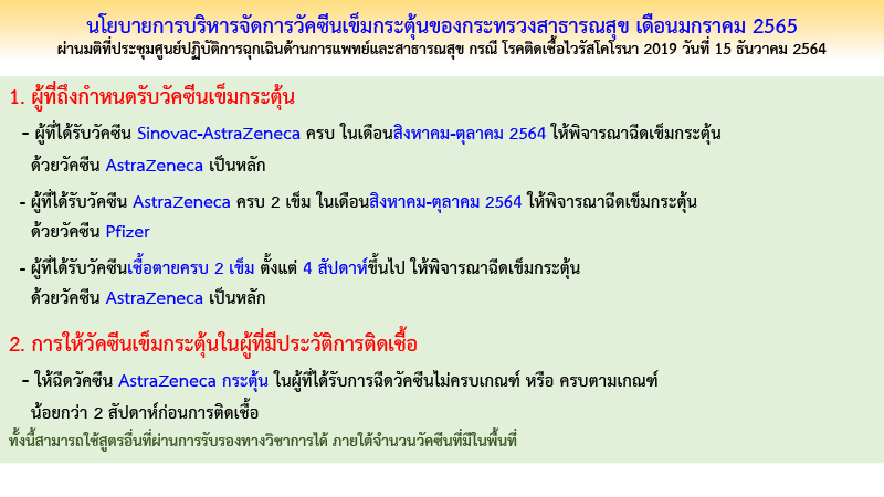 พญ.อภิสมัย กล่าวด้วยว่า อธิบดีกรมควบคุมโรคได้ออกมาเน้นยน้ำว่า วัคซีนทุกยี่ห้อมีประสิทธิภาพสูงในการป้องกันการป่วยรุนแรงและเสียชีวิต คนที่ฉีดครบ 2 เข็ม จากรายงานจะพบว่าภูมิคุ้มกันลดลงได้เมื่อเวลาผ่านไป และหากฉีดเข็ม 3 ก็จะทำให้ภูมิคุ้มกันสูงขึ้น ทำให้ควบคุมการแพร่ระบาดได้อย่างมีประสิทธิภาพ การฉีดเข็ม 3 ด้วย แอสตร้าเซนเนก้า หรือ ไฟเซอร์ การศึกษาพบว่าให้ผลกระตุ้นภูมิคุ้มกันได้สูงไม่แตกต่างกัน จึงขอความร่วมมือประชาชนในการเข้ารับการฉีดวัคซีนเข็มกระตุ้นต่อไป