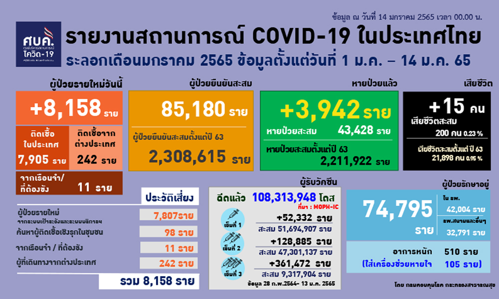 สำนักข่าวอิศรา (www.isranews.org) รายงานว่า เมื่อวันที่ 14 ม.ค.2565 พญ.อภิสมัย ศรีรังสรรค์ ผู้ช่วยโฆษกศูนย์บริหารสถาการณ์โควิด-19 (ศบค.) รายงานสถานการณ์ประจำวัน โดยพบผู้ป่วยรายใหม่ 8,158 ราย จำแนกเป็น ติดเชื้อในประเทศ 7,905 ราย เกิดจากระบบเฝ้าระวังและระบบบริการฯ 7,807 ราย เกิดจากการค้นหาเชิงรุกและพบการติดเชื้อในชุมชน 98 ราย ติดเชื้อภายในเรือนจำ 11 ราย อีก 242 รายเดินทางกลับมาจากต่างประเทศ รวมผู้ป่วยสะสม 2,308,615 ราย